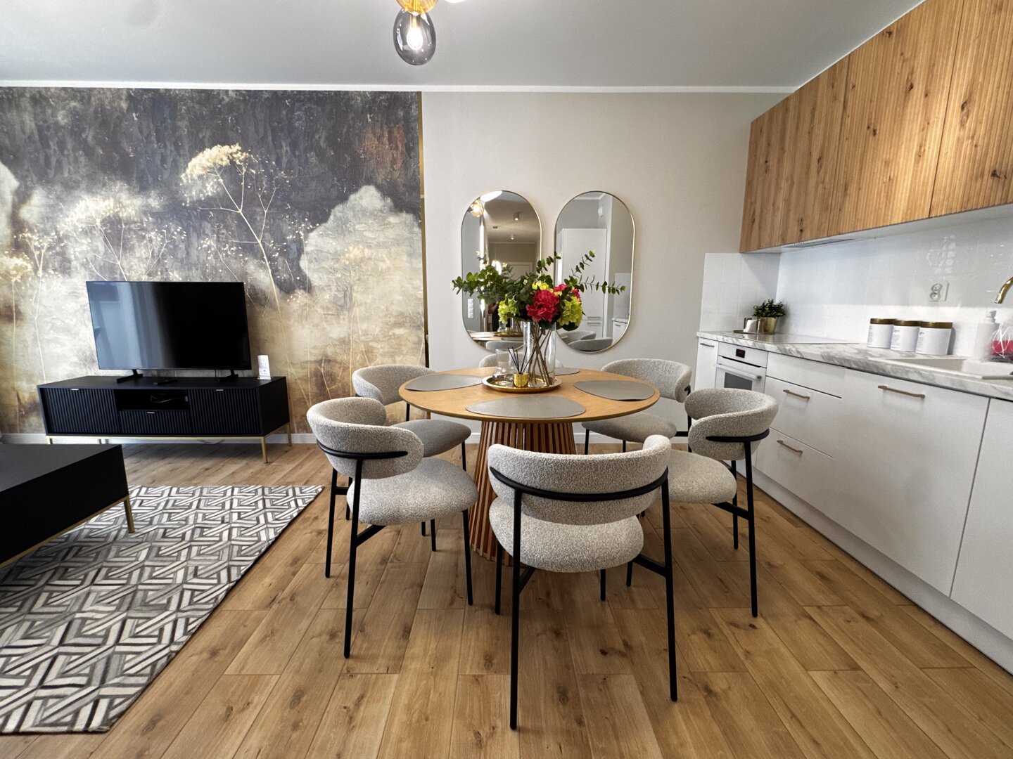 Zapraszamy do wynajęcia nowoczesnego i komfortowego apartamentu o powierzchni 63 m², który idealnie sprawdzi się dla 4 do 6 osób. Wnętrze zostało urządzone w eleganckim stylu, a motywem przewodnim mebli jest kolor czarny, nadający przestrzeni wyjątkowego charakteru.
