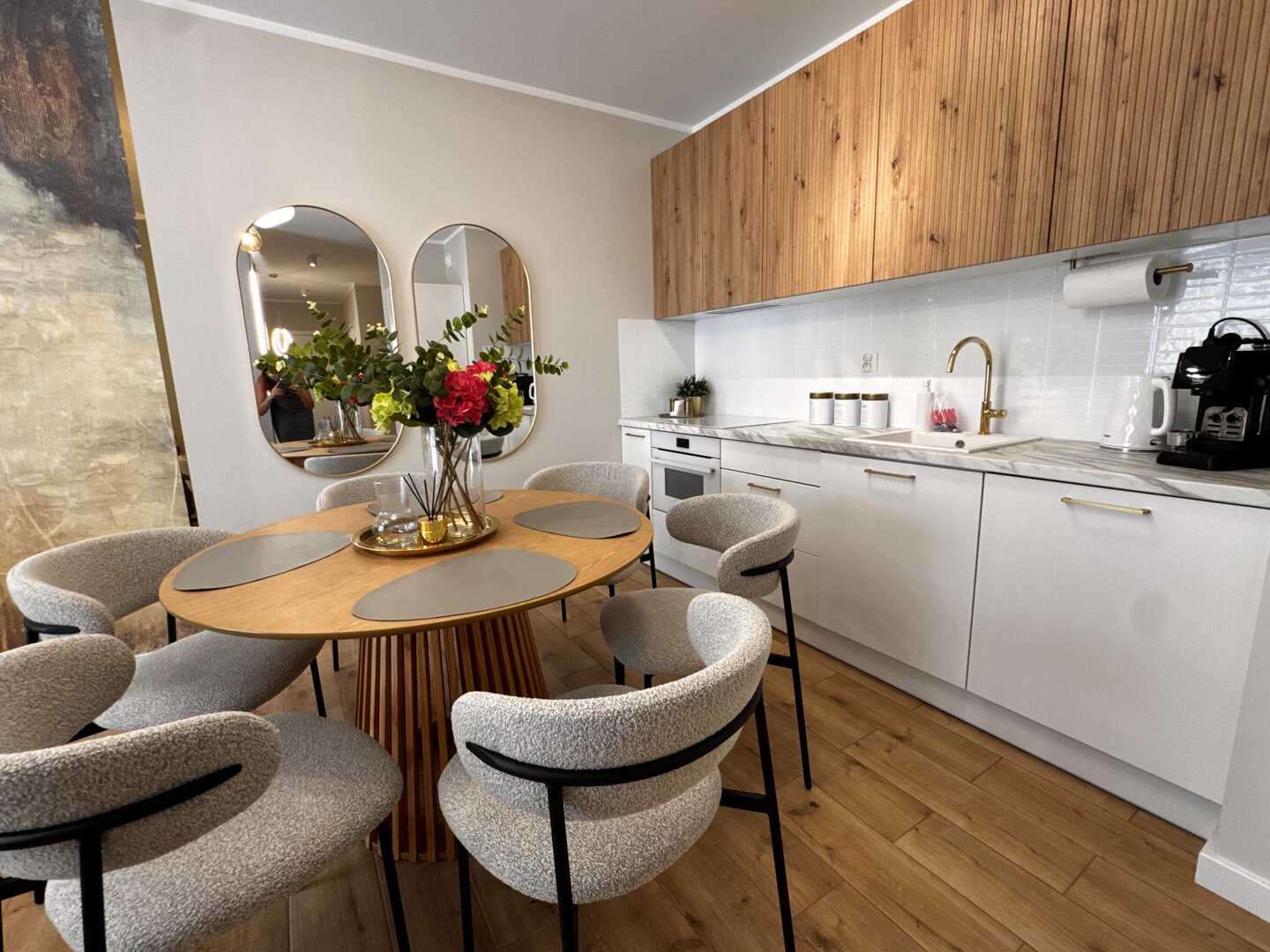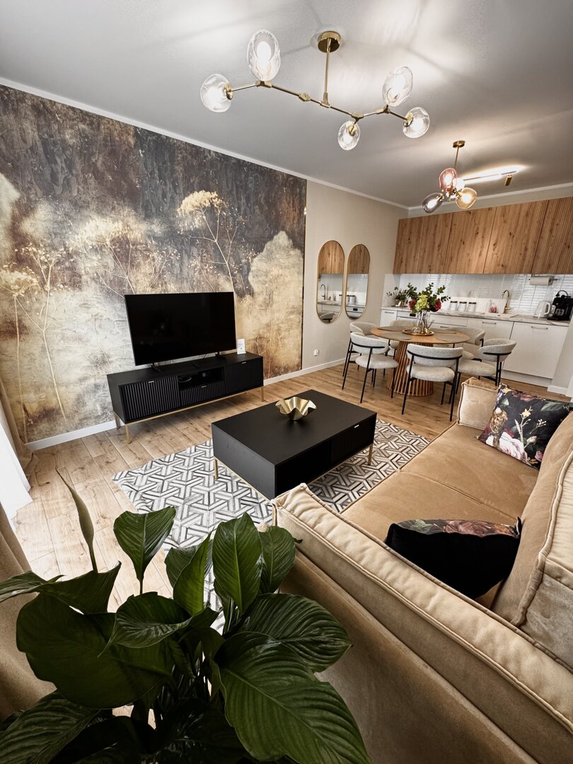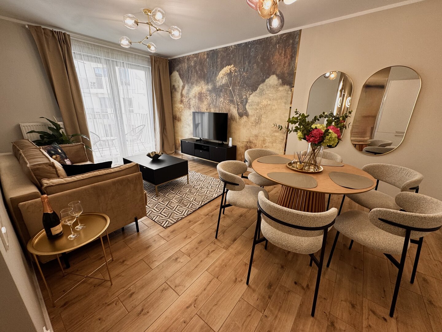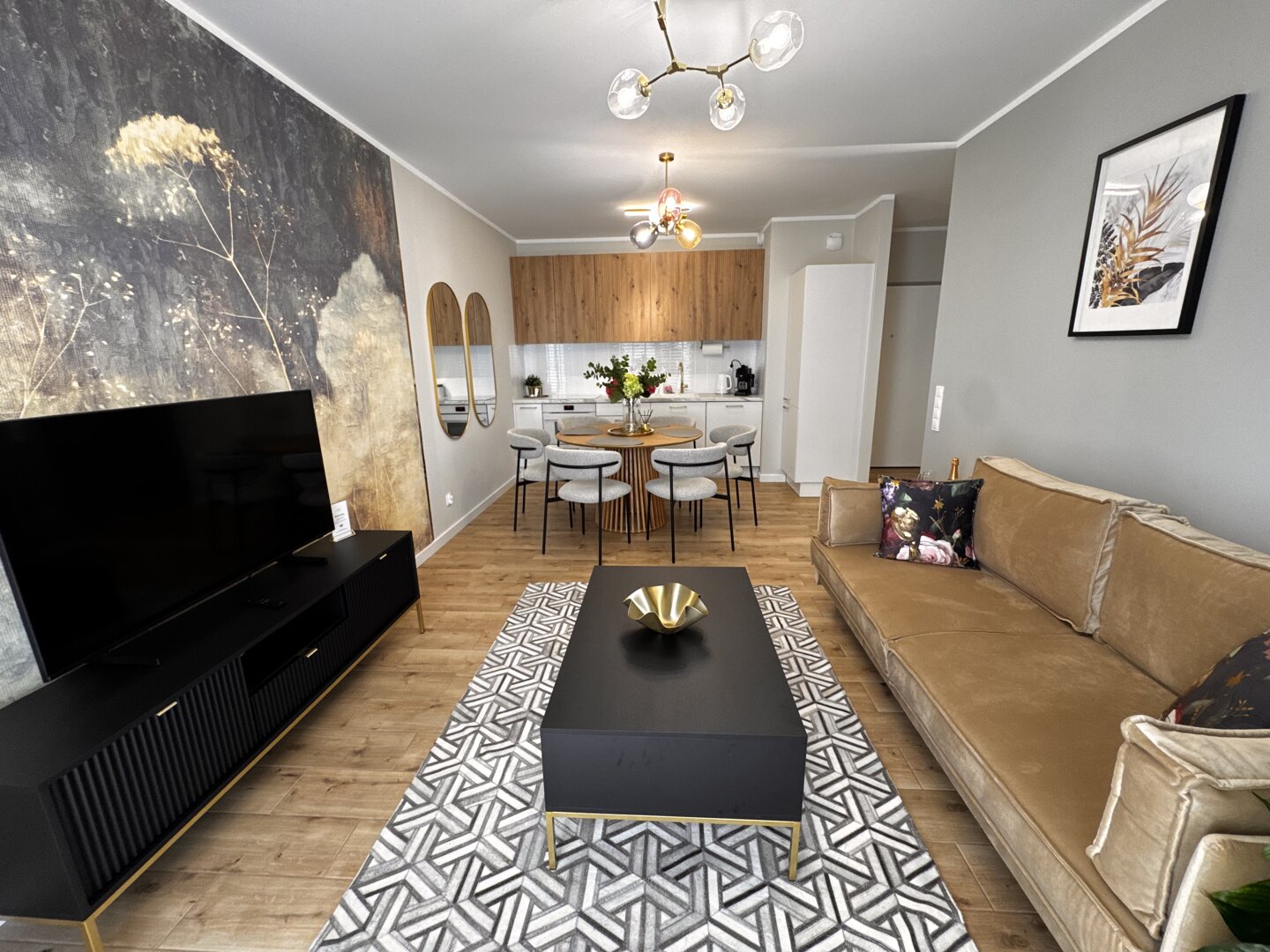 Elegancki i przestronny apartament o powierzchni 67 m², idealny dla 4 do 6 osób. Stylowe wnętrze ze złotymi akcentami zapewnia wyjątkowy klimat.
