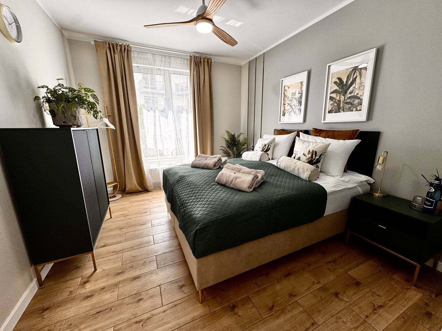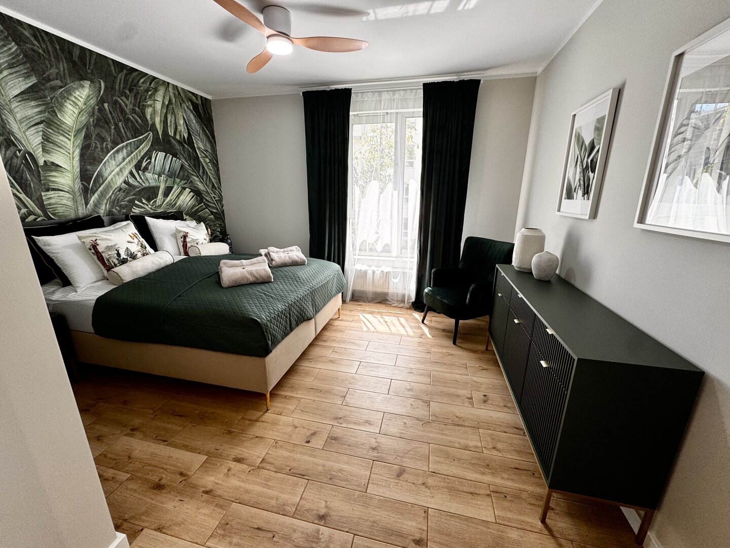 Oferujemy do wynajęcia nowoczesny i komfortowy apartament o powierzchni 63 m², idealny dla 4 do 6 osób. Stylowe wnętrze z zielonymi akcentami nadaje mu wyjątkowy charakter i przytulną atmosferę.